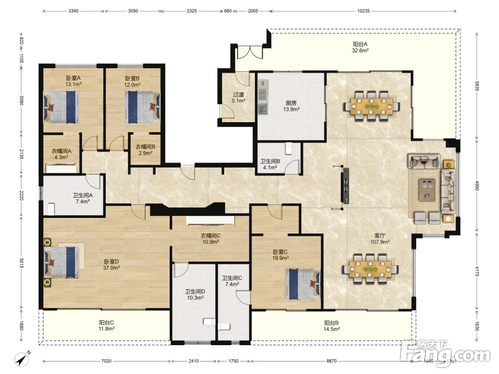 户型齐全,主打户型方正,主卧套间,带衣帽间,L型厨房四居