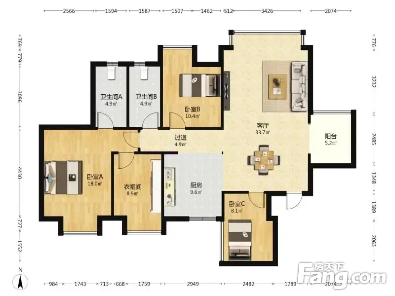 户型齐全,主打明厨,明卫,客厅朝南,全明格局,双阳台,主卧朝南三居