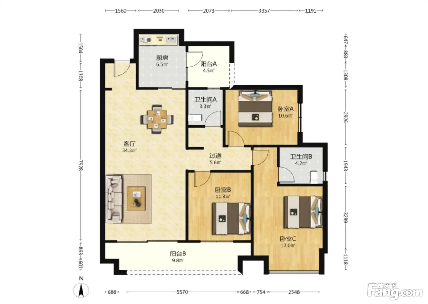 户型齐全,主打全明格局,动静分离,采光充足三居
