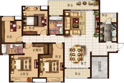 户型齐全,主打户型方正,主卧带卫,带露台五居