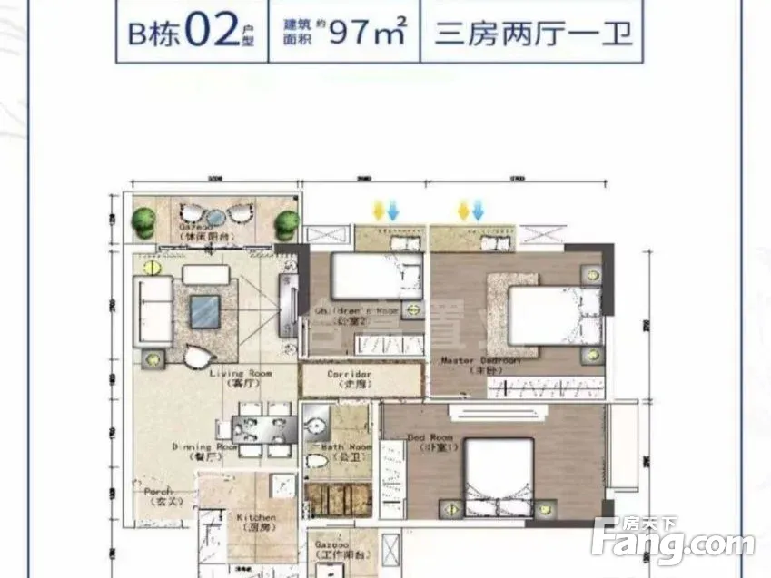 户型齐全,主打动静分离,客厅朝南,主卧朝南,观景飘窗,厨卫不对门,双阳台三居