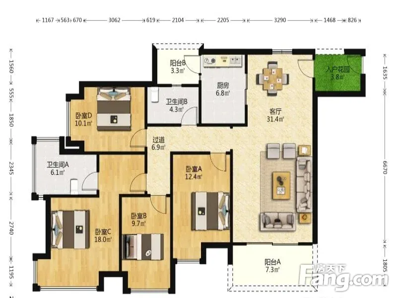 户型齐全,主打动静分离,L型厨房,大面宽阳台三居