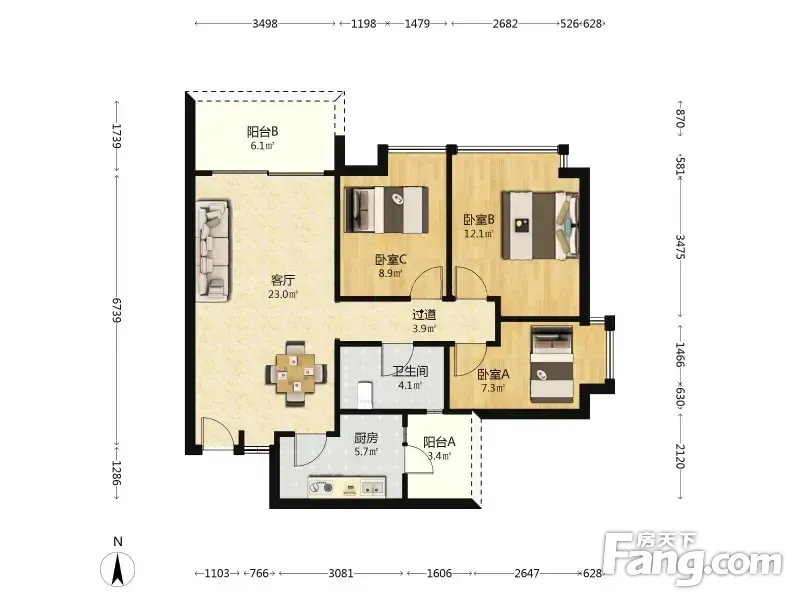 户型齐全,主打户型方正,明卫,客厅朝南,双阳台三居