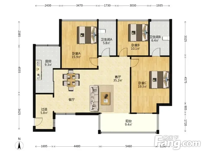 户型齐全,主打动静分离,采光充足,干湿分离,餐客分离三居