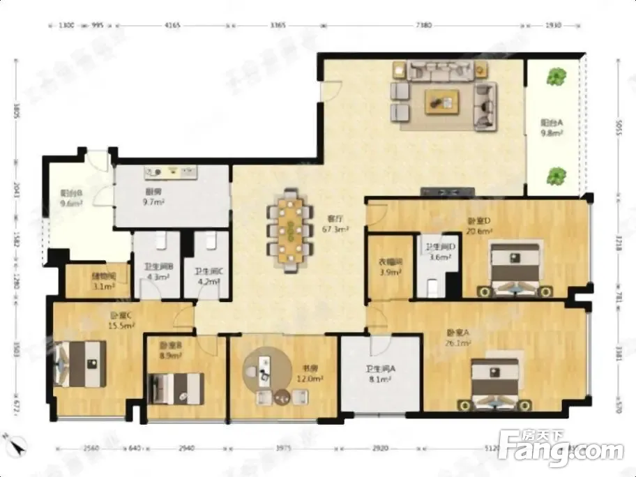 户型齐全,主打明卫,明厨,独立衣帽间,双阳台四居