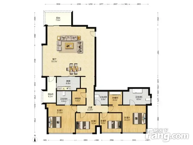 户型齐全,主打客厅朝南,户型方正,明卫四居