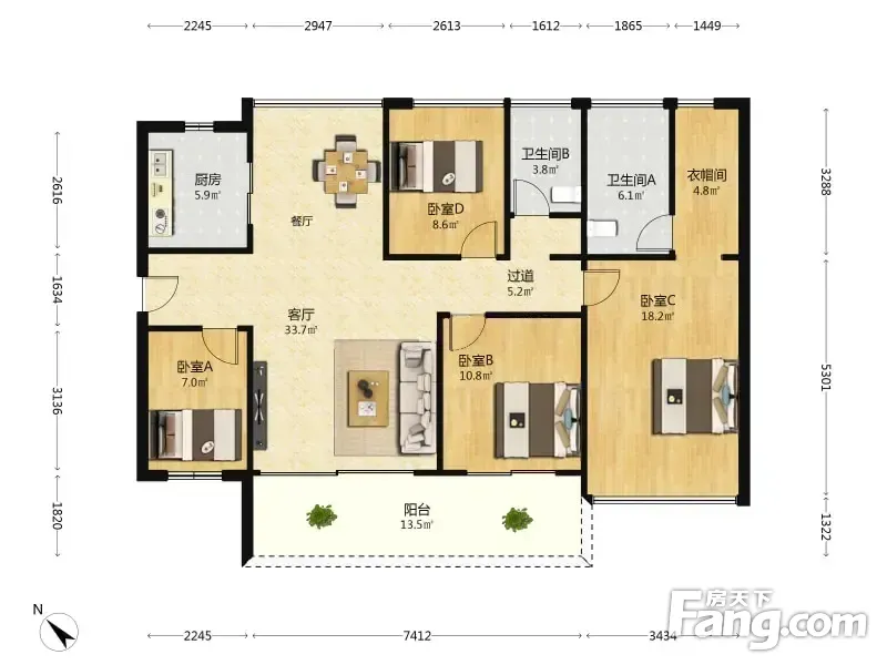 户型齐全,主打南北通透,户型方正,动静分离,采光充足,主卧带卫,厨卫不对门,明厨明卫,大面宽阳台四居