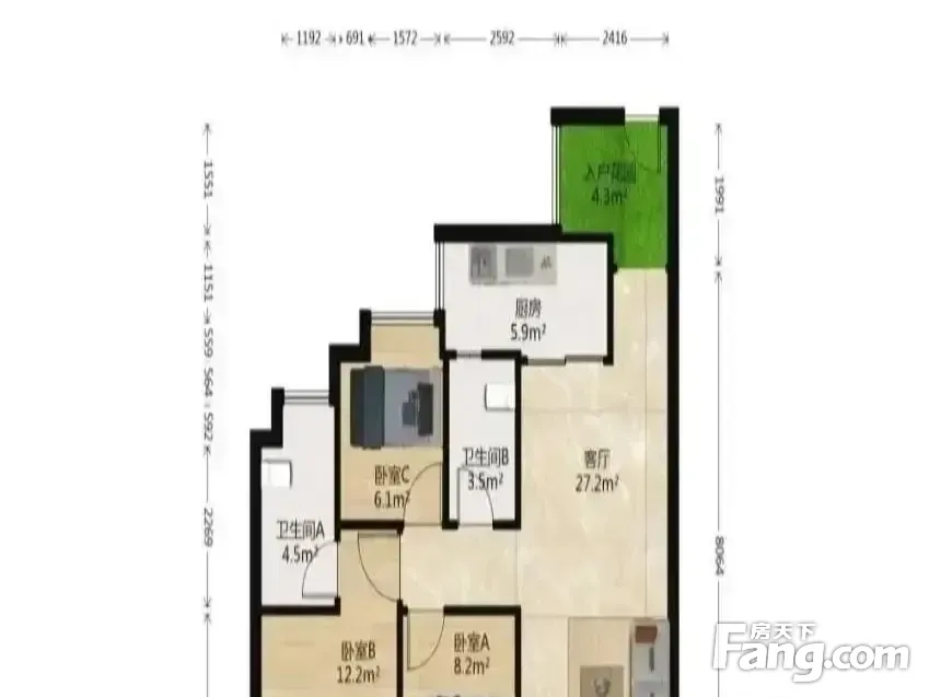户型齐全,主打客厅朝南,厨卫不对门,入户花园三居