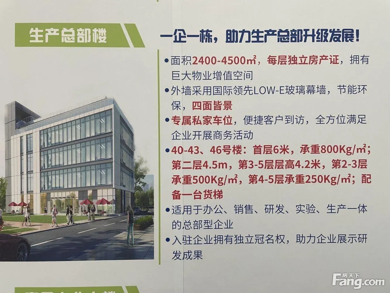 为不同阶段企业悉心打造,一企一栋,彰显尊贵气质! 面积2100-4800㎡,每层面积由360-1000㎡,每层独立房产证; 外墙采用国际LOW-E中空玻璃,节能环保,四面皆景。 专属私家车位,便捷客户到访,全方位满足企业开展商务活动。适用用于销售、研发、实验为一体的总部型企业。 首层通高8.8m独特架空设计,标准层4m,实用率。 入驻企业拥有独立冠名权。