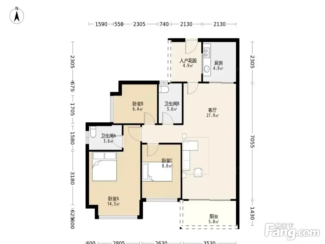 户型齐全,主打客厅朝南,主卧朝南,主卧带卫,卧室带阳台,餐客分离,入户花园三居