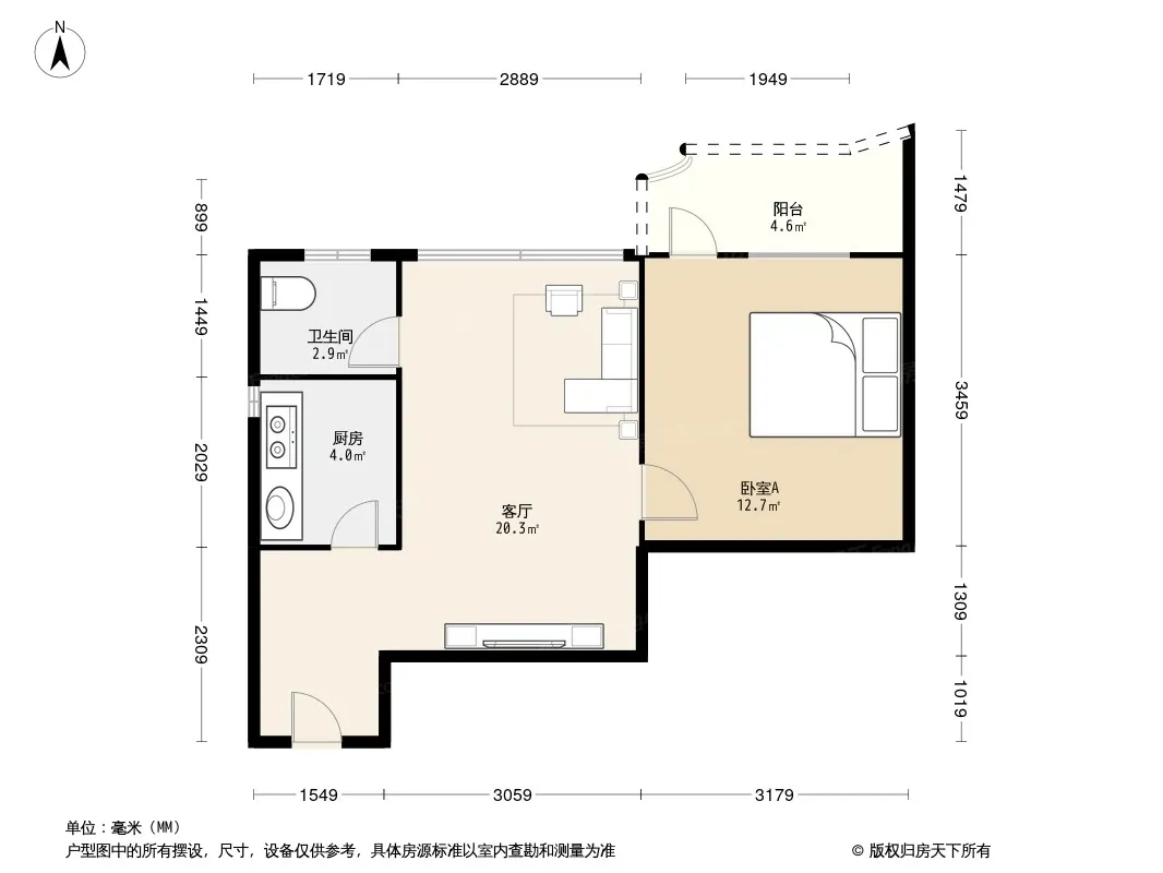 户型齐全,主打明厨,明卫,客厅朝南,全明格局一居