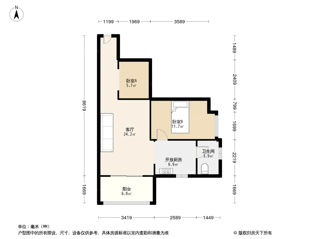 户型齐全,主打明厨,明卫,客厅朝南,全明格局二居