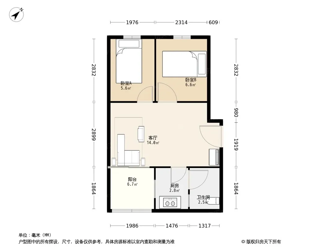 户型齐全,主打明厨,客厅朝南二居