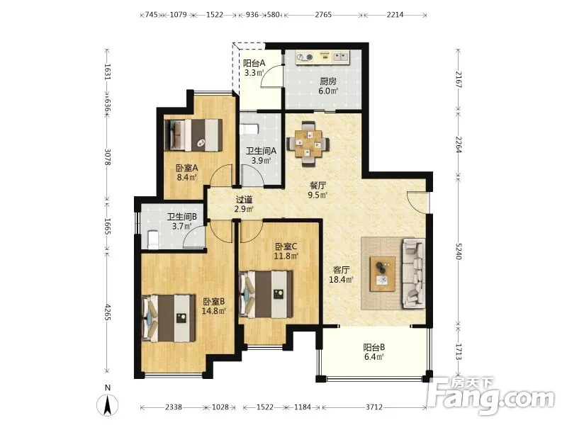 户型齐全,主打户型方正,明卫,客厅朝南,双阳台三居
