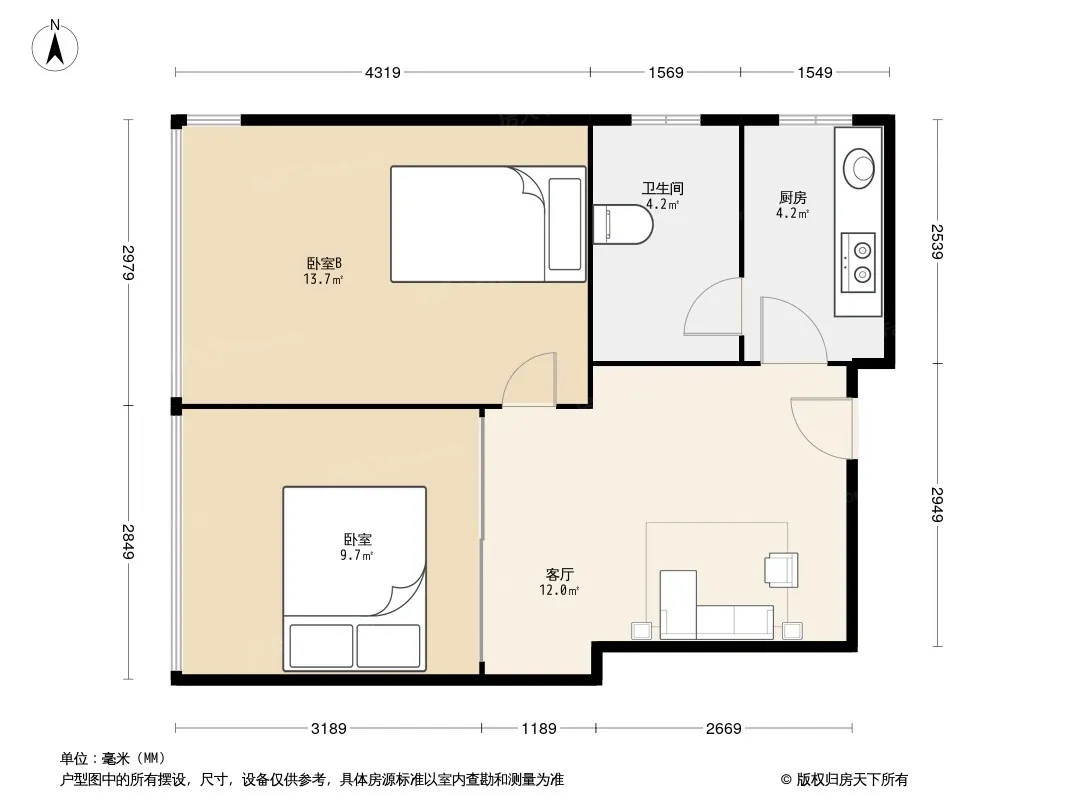 户型齐全,主打明厨,明卫,客厅朝南,全明格局,主卧朝南二居