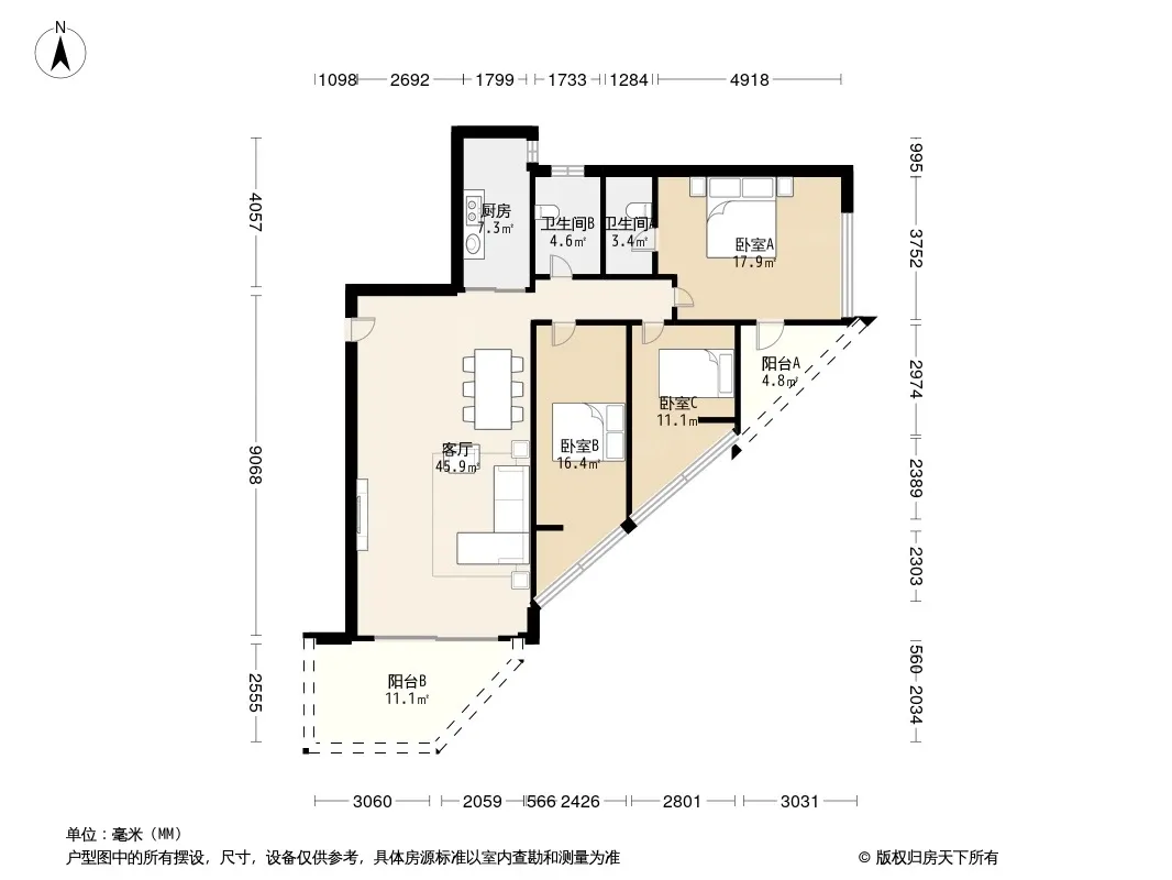 碧水明筑东南向三房,通风采光好。格局方正实用。