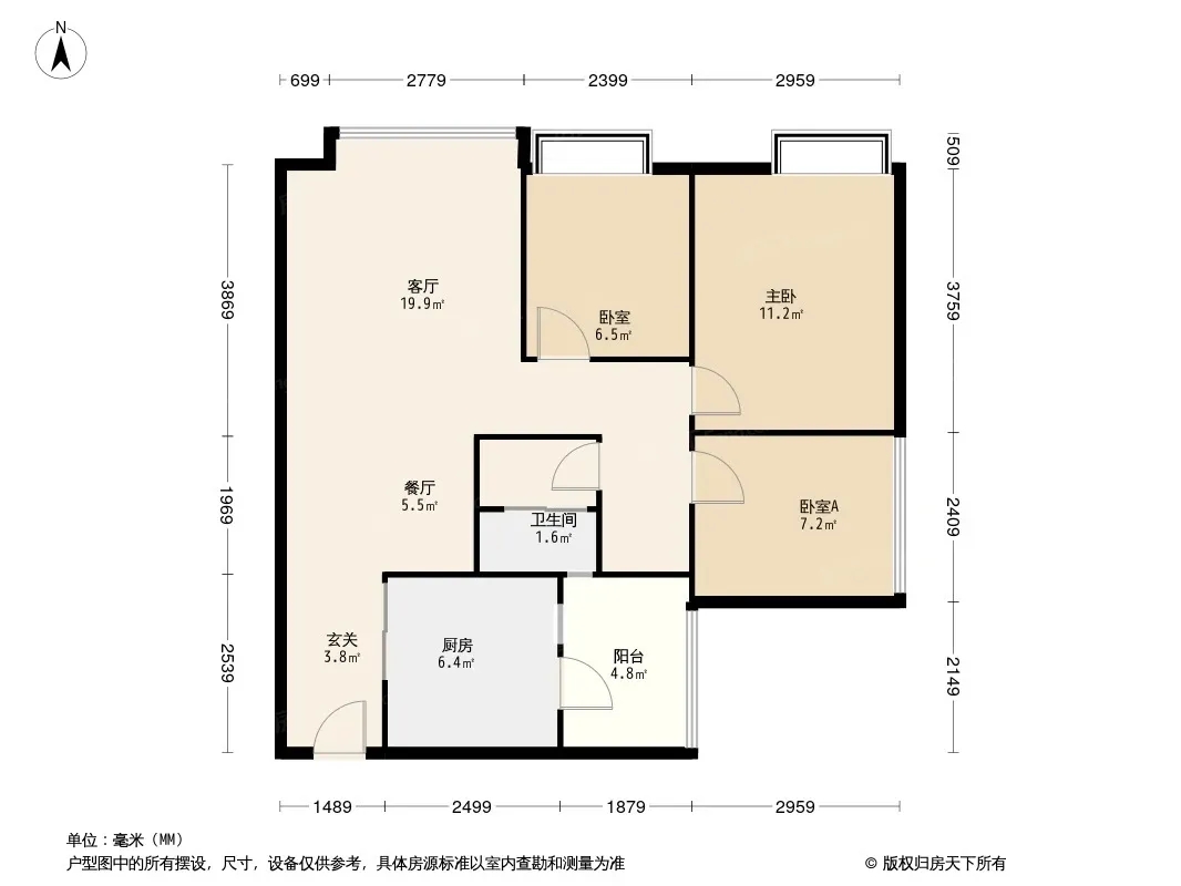 户型齐全,主打南北通透,客厅朝南,U型厨房三居