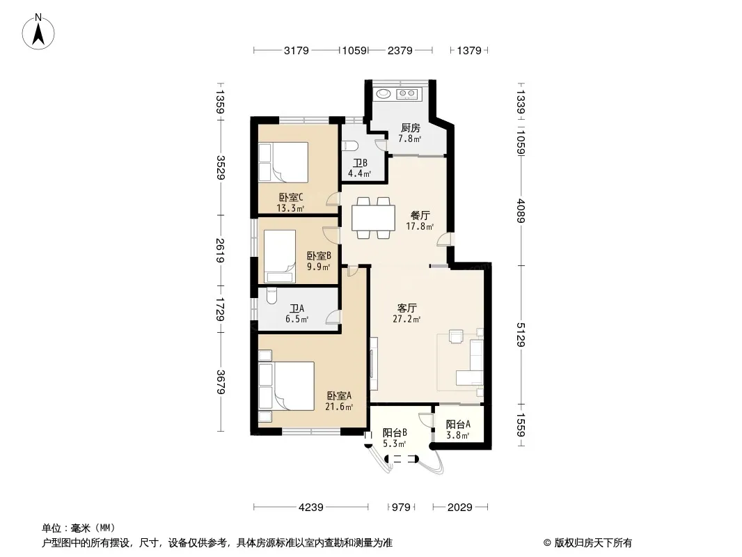 户型齐全,主打明卫,明厨,客厅朝南,全明格局,双卧朝南三居