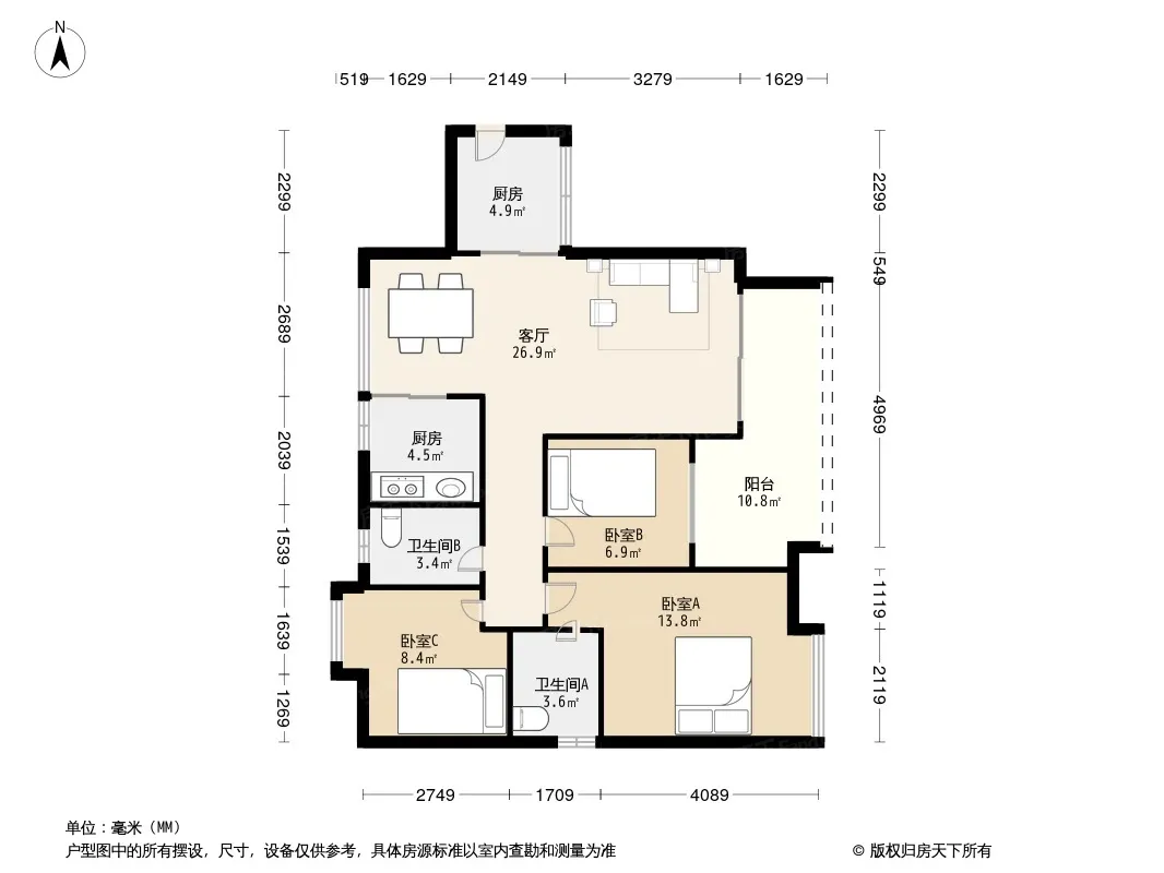 户型齐全,主打户型方正,明卫,明厨,客厅朝南,全明格局三居
