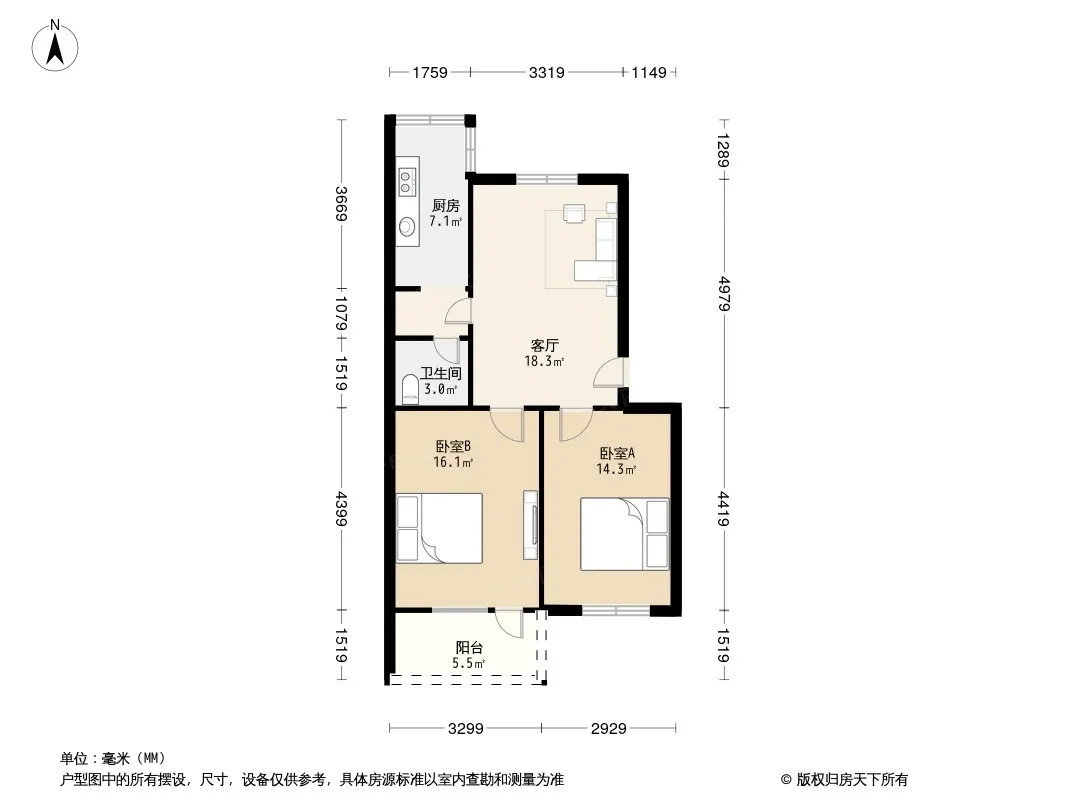 户型齐全,主打户型方正,明卫,明厨,客厅朝南,主卧朝南二居