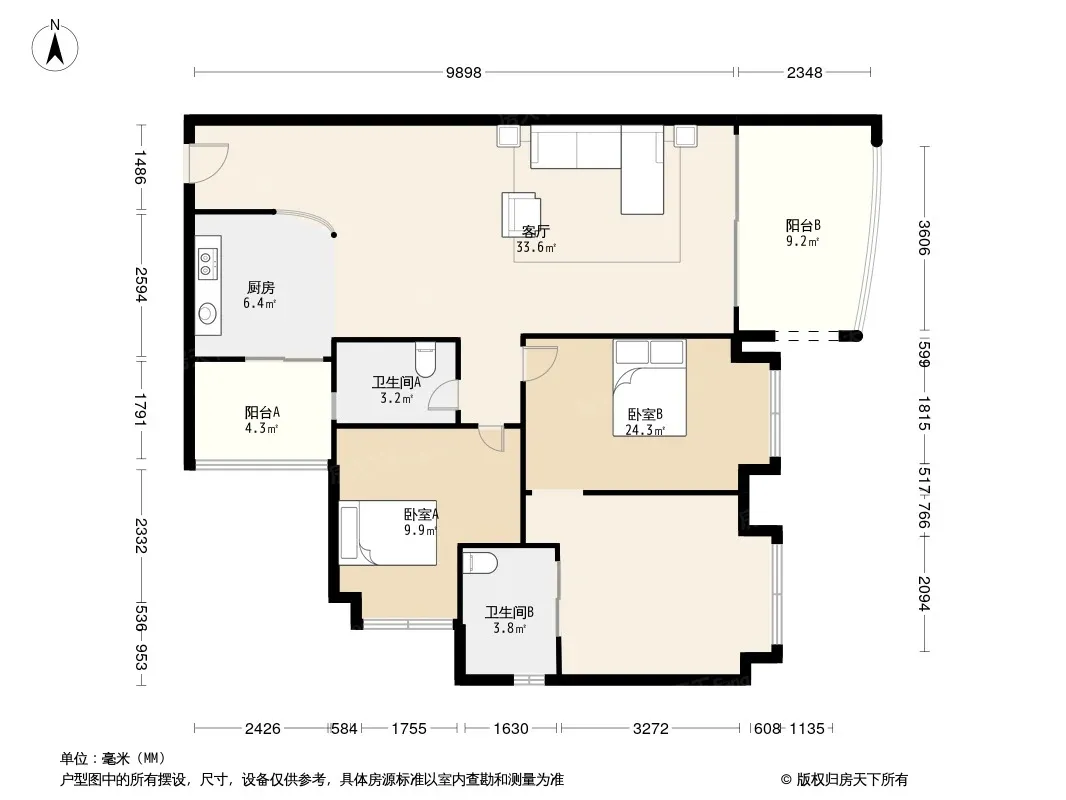 104方少放盘南向户型 三房两卫 采光好