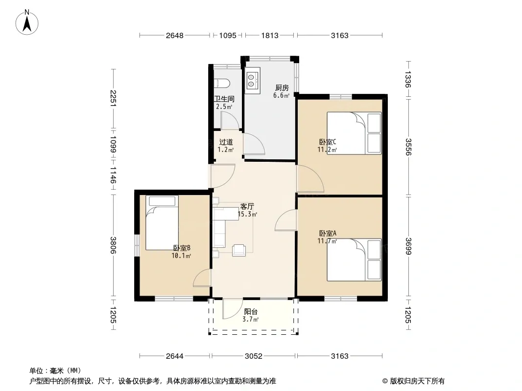 户型齐全,主打明厨,客厅朝南二居