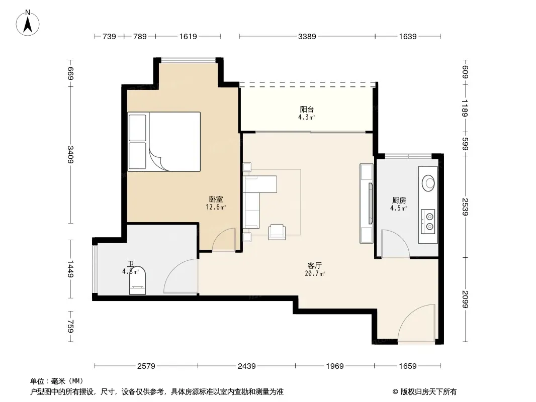 正规一房一厅,户型方正实用,视野开阔,光线好