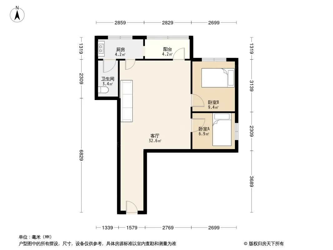 户型齐全,主打明厨,客厅朝南,主卧朝南二居