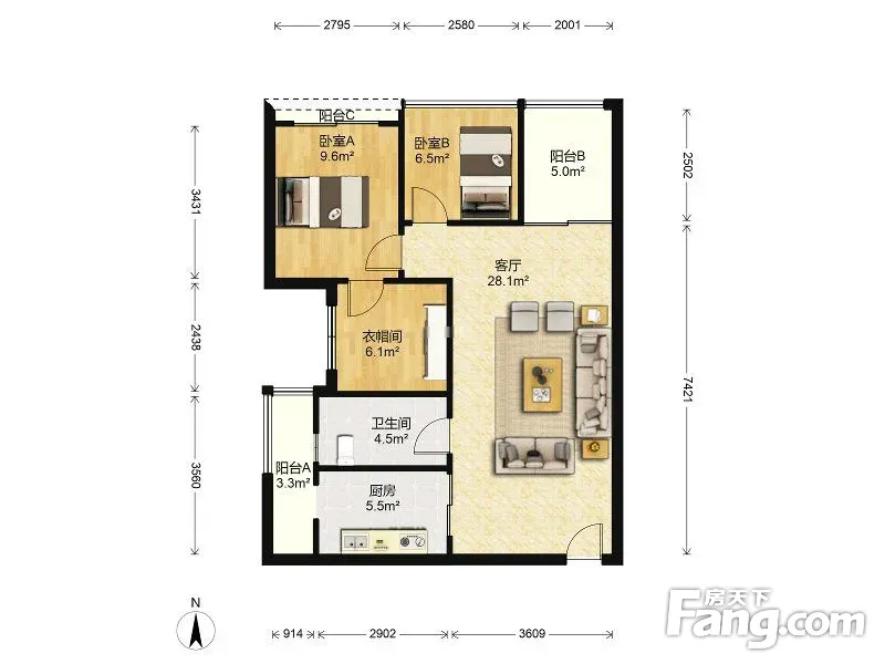 户型齐全,主打户型方正,明厨,主卧朝南二居