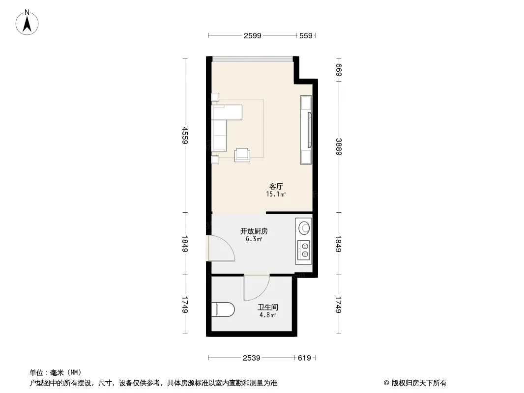 户型齐全,主打明卫,明厨,客厅朝南,全明格局一居
