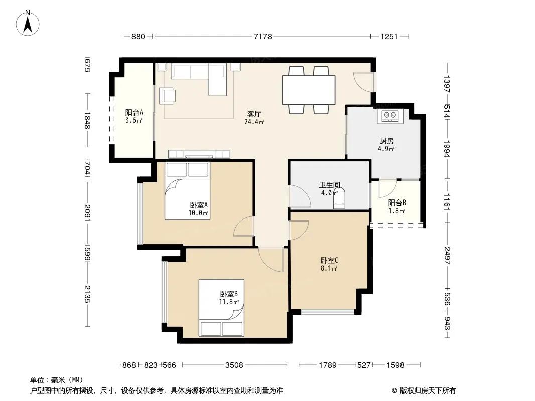 户型齐全,主打客厅朝南,双阳台三居