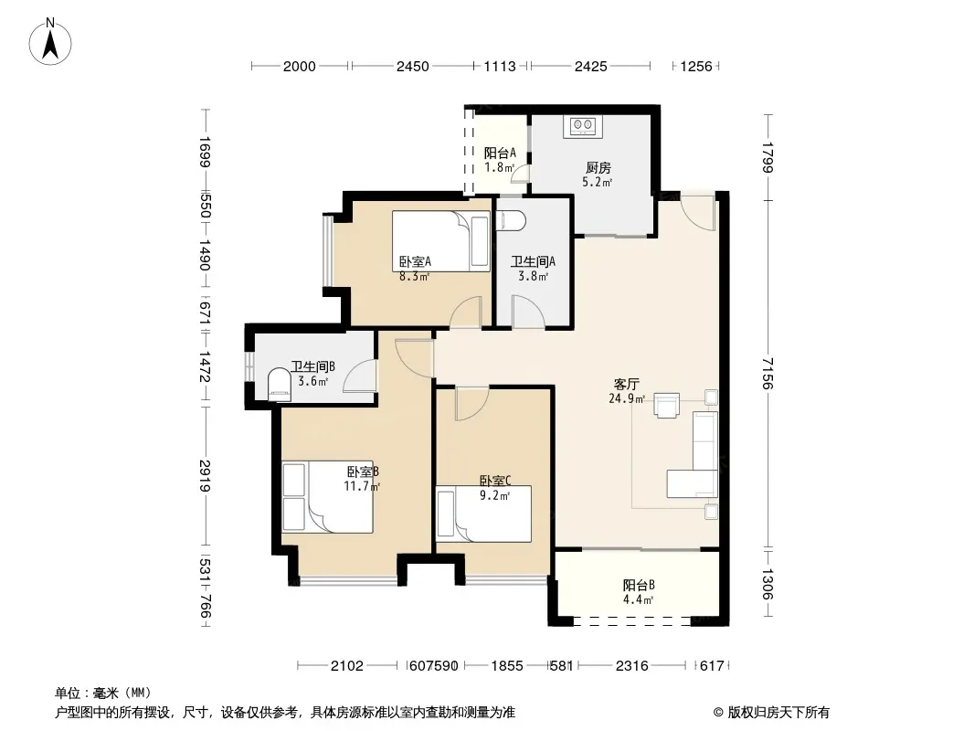 户型齐全,主打客厅朝南,双阳台三居