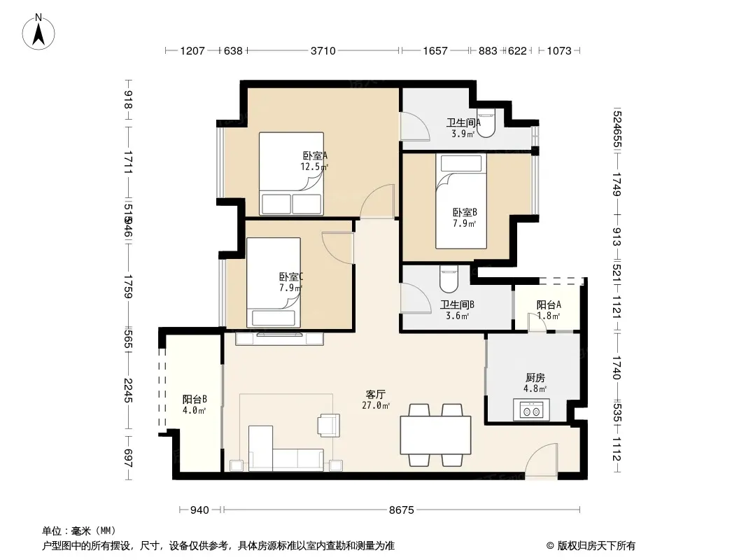 户型齐全,主打客厅朝南,双阳台三居