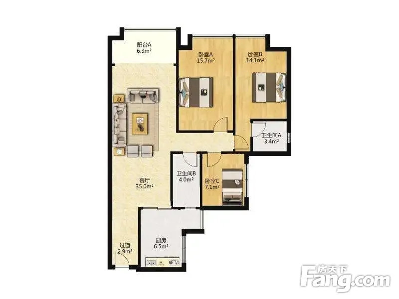 户型齐全,主打户型方正,明厨,主卧朝南二居
