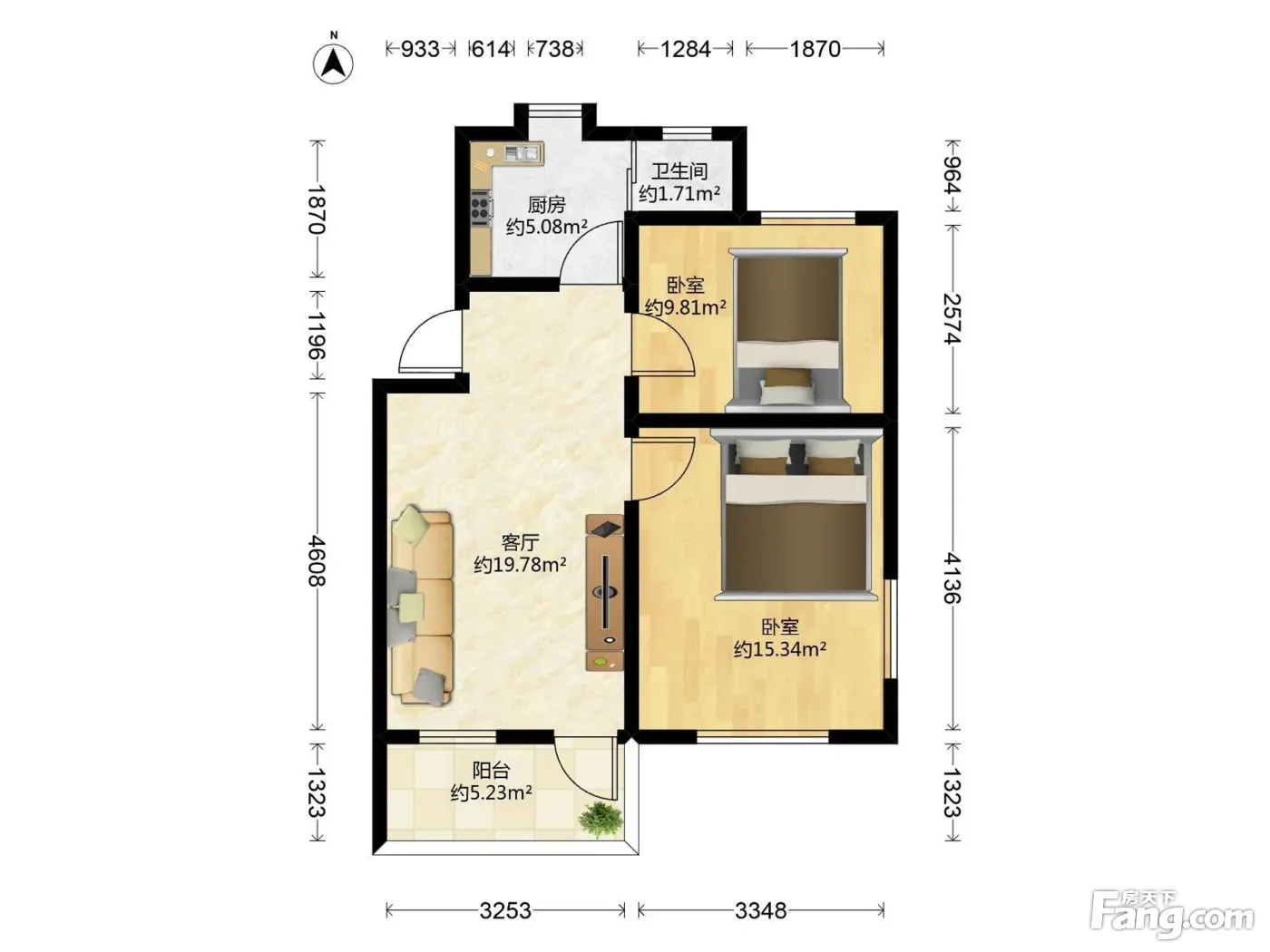 标准二房一厅 南北向 全明屋 方正 厅出阳台 带装修