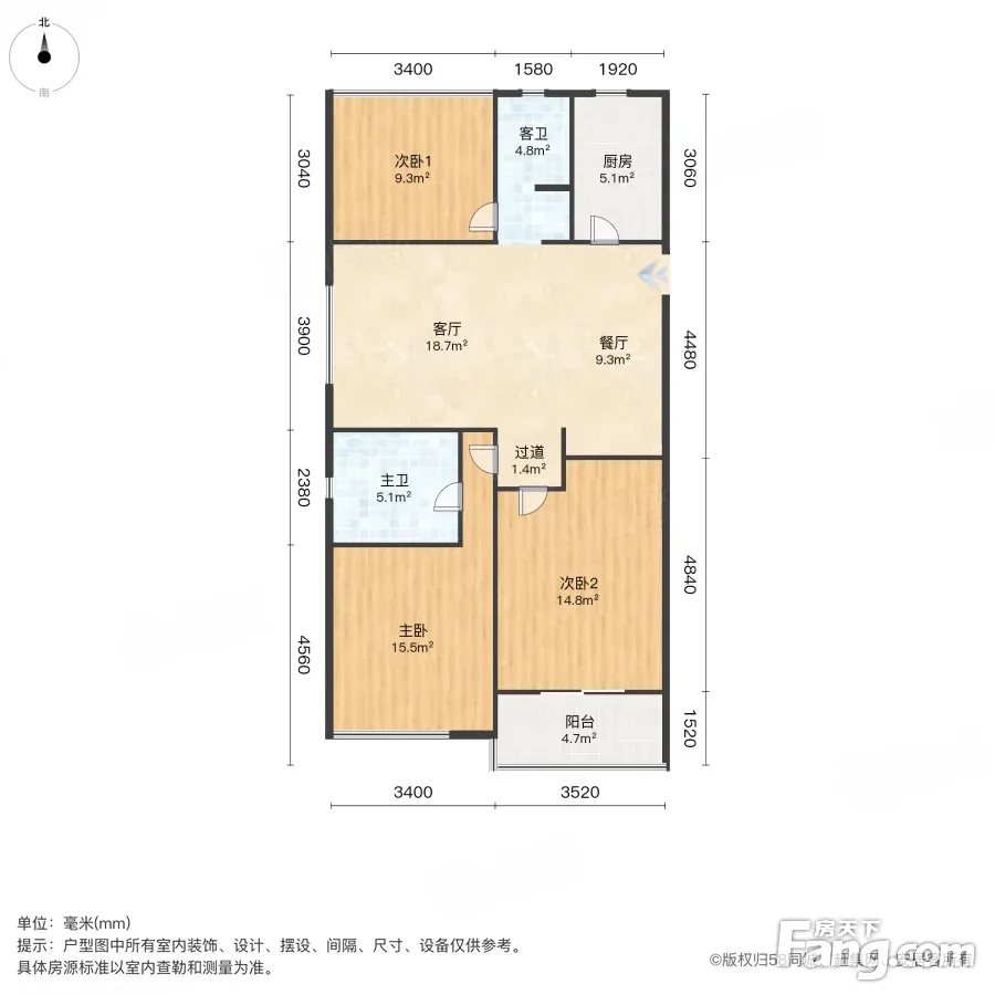 户型齐全,主打动静分离,三开间朝南三居