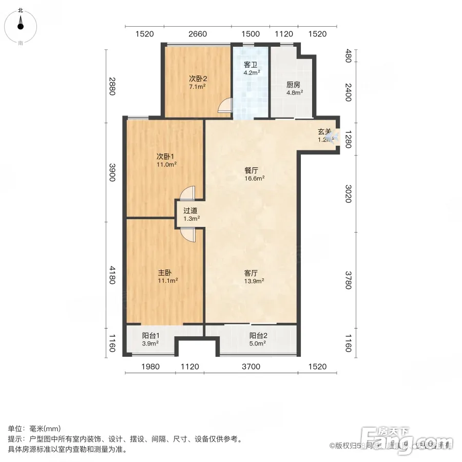 户型齐全,主打动静分离,三开间朝南三居