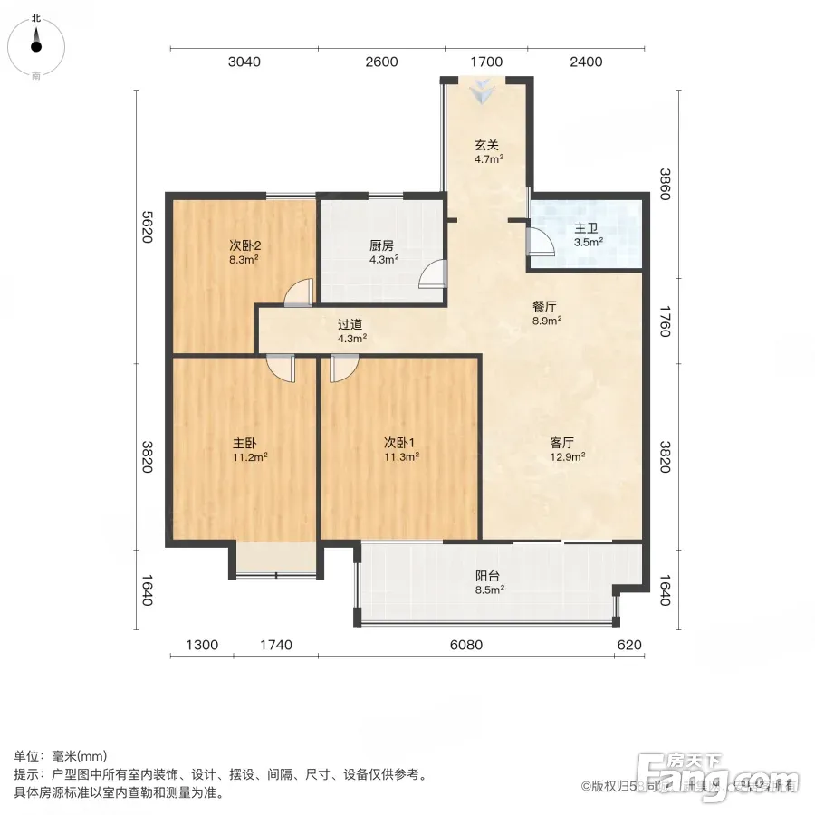 户型齐全,主打动静分离,三开间朝南三居