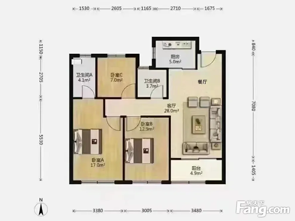 户型齐全,主打户型方正,明厨,明卫,客厅朝南,全明格局三居