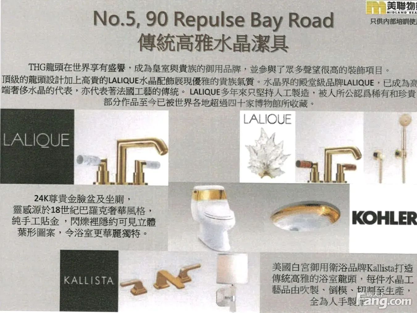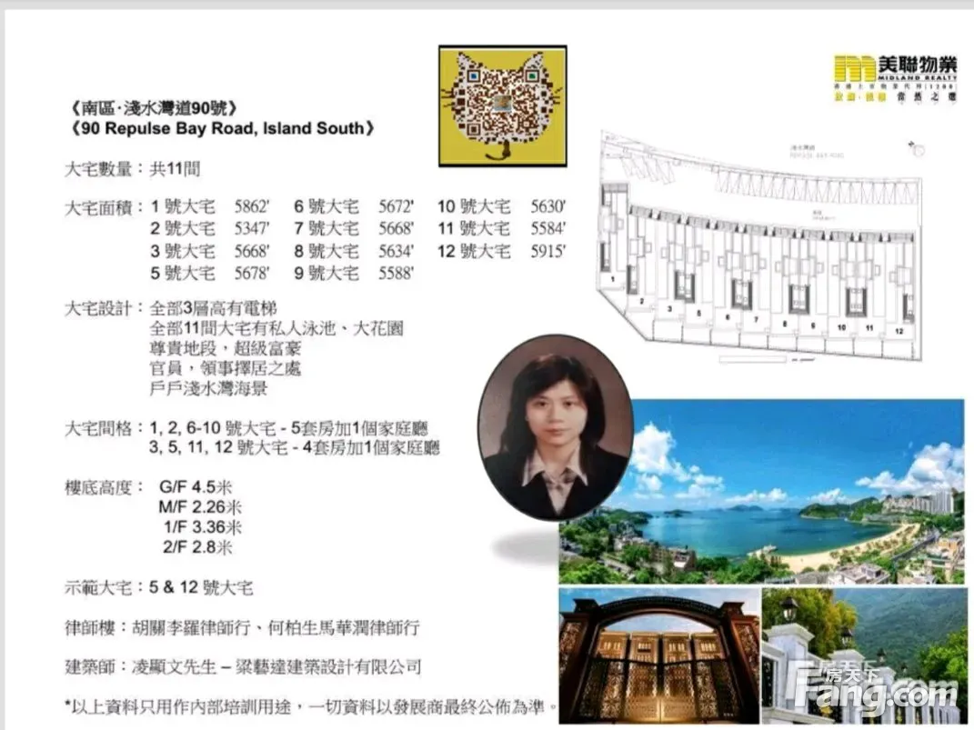 项目名称: 浅水湾道90号 No.90 Repulse Bay Road 发 展 商: 长实地产 地 址: 港岛 南区浅水湾道90号 座 数:11伙 独立洋房 楼 层:3层高设计 楼层高度:地下高4.5米, 一楼高3.36米, 2楼高2.8米。 实用面积 :5347‘-5915’ 平方呎 洋房间隔:4套房(4间) 或 5套房(7间) 花园:前花园设计 电梯:附内置电梯 长阔:屋长约80呎,屋阔约21呎 车位:每幢洋房有2个车位 方向:西南 景观:全浅水湾海景 用料:外型附有琉璃工艺 及 选用 I G U双层中空玻璃 管理公司: 港基物业管理有限公司 管理月费 : 未公布 校 网:18区校网 *屋苑采用英国维多利亚式宫庭设计 *每间屋云石外墙石材、门面设计各有不同 *每栋别墅全部是三层, 有内置电梯 *拥有私人泳池、花园 *拥抱 辽阔浅水湾迷人海景致