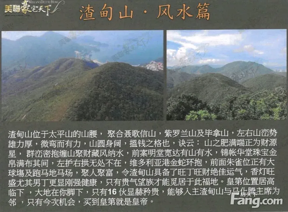 小区配套渣甸山位于太平山山腰, 聚合聂歌信山, 紫罗兰山及毕拿山, 左右山峦雄厚, 微弯有力, 山圆身阔是搵钱之格局。诀云: 山之肥满端正为财源星, 群峦密布 聚财纳藏佈局, 前案名堂宽达有山有水, 珠宝金帛满布, 左拥右抱无处不在, 维多利亚港金蛇环抱,前面朱雀位正是大球场及跑马地马场, 聚人聚富, 令渣甸山享有丁财两旺之势,香灯旺盛有利男丁,只有显赫贵人能够入住此福地渣甸山景观方面: 项目处于高地俯览跑马地及半山一带景致。交通方面: 项目有32个私家车位,平均每户会有两个车位认购权。白建时道沿线有专线小巴往返港铁金钟站, 皇后大道东,太古广场, 港铁湾仔站,合和中心,铜锣湾和渣甸山