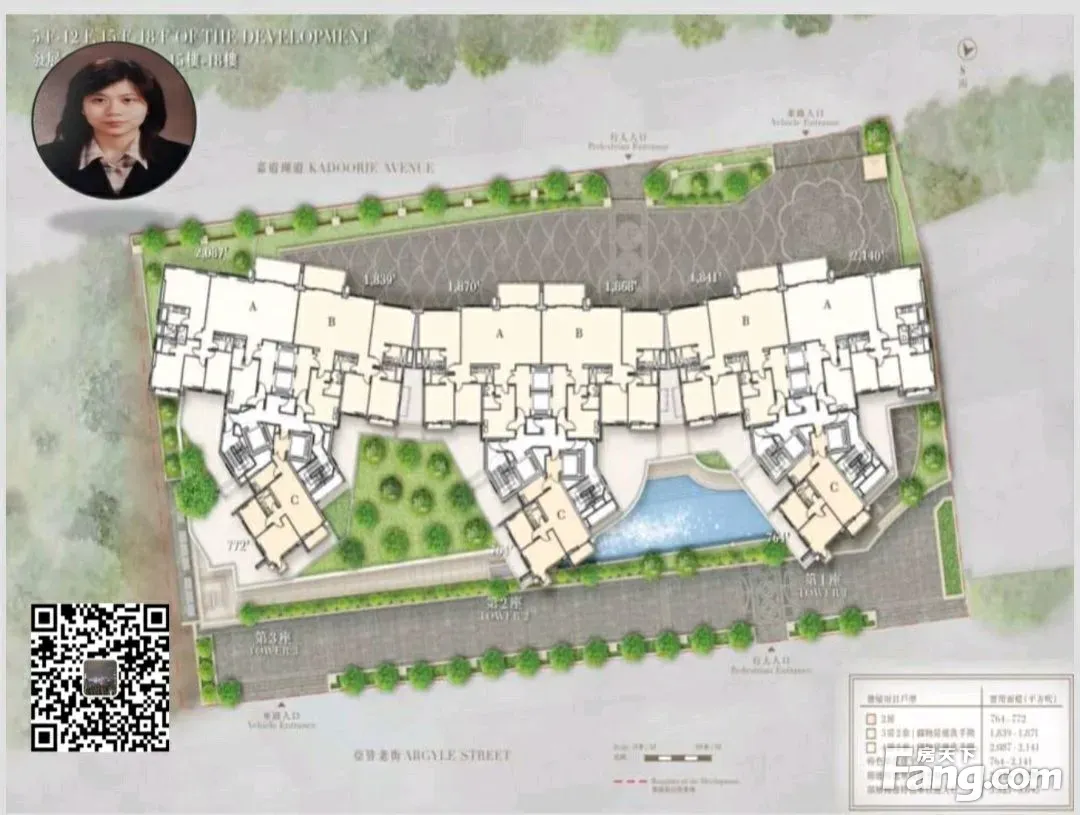 景观方面: 项目位于加多利山上处,第1及2座的A、B室向西北享加多利山翠绿及洋房群景致;第3座C室面向东南,以望市区楼为主 单位供应以三、四房为主。其中三房户的实用面积为1,841平方呎起;四房户的实用面积则约2,000至2,100平方呎。两房户只占少数,实用面积为764或772平方呎。 厨房设有Sub-Zero品牌双门雪柜、Miele品牌洗衣机及干衣机、Gaggenau品牌气体煮食炉及电磁炉、微波炉、暖碟抽屉、洗碗碟机等设备。