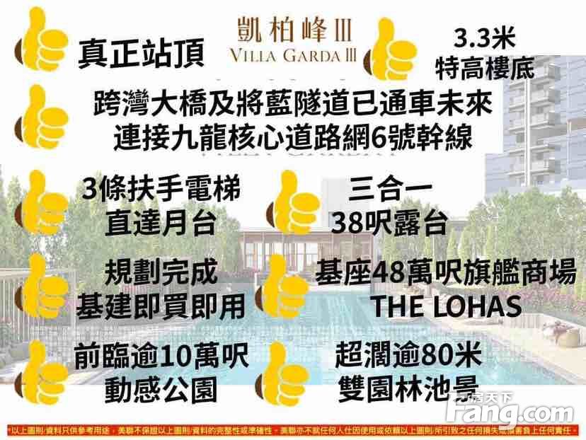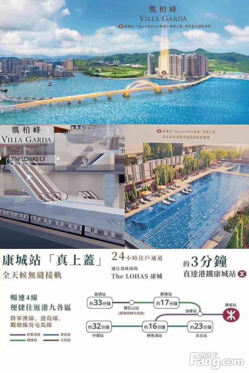康城站上蓋Villa Garda 凱柏峰III 人才PLAN精選1房340' $576萬2房451' $692萬2房半572'$918萬3房719'$1206萬 呎價低至15168呎特高樓底:3.3米(區內罕有)特大露台:露台+工作平台2合一48萬呎THE LOHAS商場及港鐵站上蓋前臨動感公園及開揚山景景緻物業小檔案發展商:信置/嘉華/招商期數:共3期項目總數:644伙關鍵日期:2025年1月户型:戶型分佈開放式 約283呎1房 (開放廚) 約340呎2房 (開放廚) 約452呎2房半 (水晶廚) 約572呎3房半 (水晶廚) 約719呎另設平台特色戶及天台特色户*小學校網:95校網**中學校網:西貢區**物業管理:PIEMIER(港鐵公司旗下)*歡迎查詢價錢及圖則