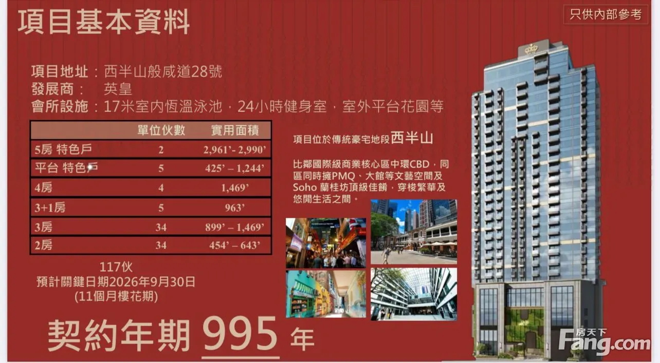 项目是由英皇国际发展的分层住宅新盘,位于港岛西半山般咸道28号,预计关键日期为2026年9月30日。 欢迎致电或VX查询 黎小姐 Yulia:VX: YuchingL 手机:132 6692 1142 #优质楼盘推介 #在线查询 #售前售后细心服务。 #楼盘买卖-豪宅推介-租務管理-投资移民升学等等 #多年地产经验!带你看香港房子,任何问题欢迎查询~ 单位的实用面积介乎425至2,990平方呎,楼底高度由2.65至4.4米,间隔涵盖二至五房,分别採用开放式或独立式厨房设计,普遍单位配置露台及工作平台。 景观方面,预料普遍单位向北享有维港海景,向南望西半山翠绿林景。 交通方面,楼盘距离港铁西营盘站约10步程;同时在般咸道沿线附近有多条巴士及小巴路线,来往港岛多个地方。 生活配套方面,项目邻近的半山扶手电梯及卑利街一带座落多间特色餐厅及酒吧;于坚道亦有民生商店及食肆可供选择。而楼盘周边亦有多间中小学及大学、医院可应付日常生活需要。 社区康乐设施方面,楼盘附近有香港医学博物馆、卜公花园及坚道花园供公众参观使用。