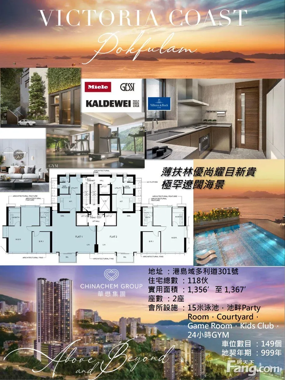 地址 :港岛域多利道301号 住宅总数 :118伙 实用面积 :1,356’至 1,367’ 座数 :2座 会所设施 :逾8600呎会所包括15米泳池,池畔Party Room, Courtyard,Game Room,Kids Club,24GYM 车位数目 :149个 发展商 :华懋 地契年期 :999年
