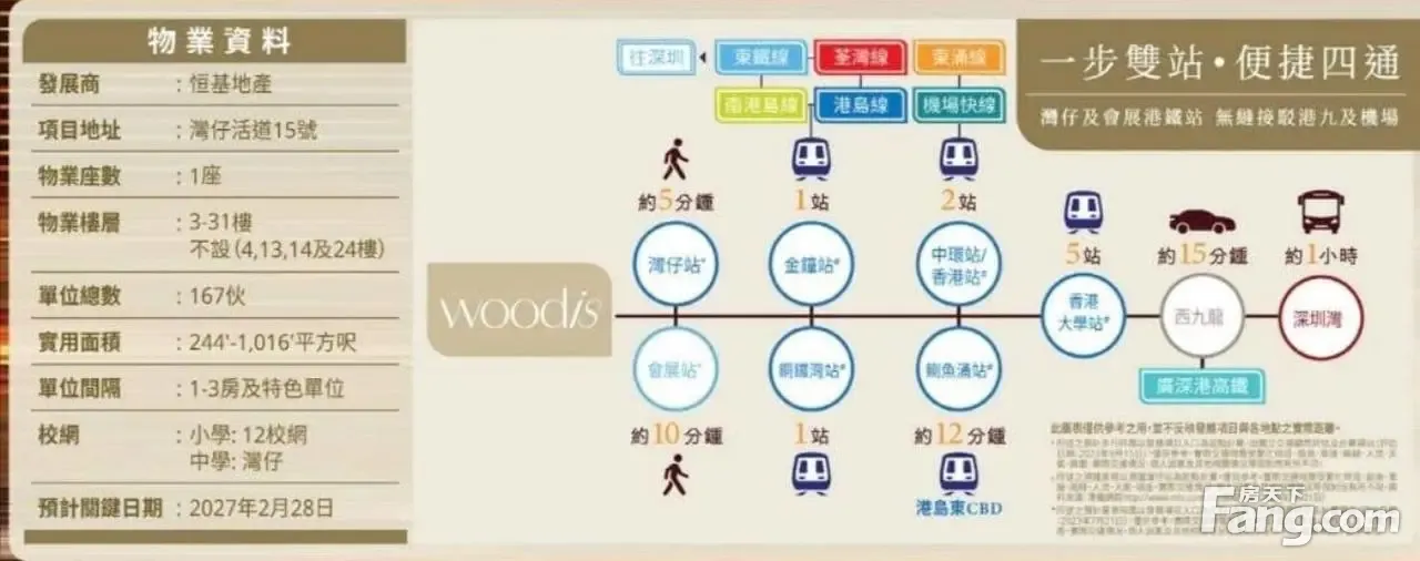 WOODIS 所在地区:港岛湾仔区 楼盘类别:单幢式住宅大厦 中文地址:活道15号 英文地址:15 Wood Road 大厦座数:1座 大厦层数:28层(不设4、13、14及24楼) 单位总数:167伙 楼层高度:3.5米 实用面积:244至1,016平方呎 单位间隔:1至3房 管理公司:尊家管业有限公司 小学校网:12校网 中学校网:湾仔区 预计落成日期:2027年2月28日 预计关键日期:2027年2月28日