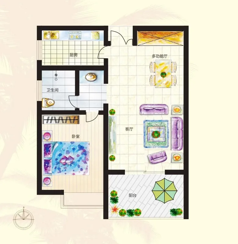 户型齐全,主打全明格局,户型方正,L型厨房,大面宽阳台一居