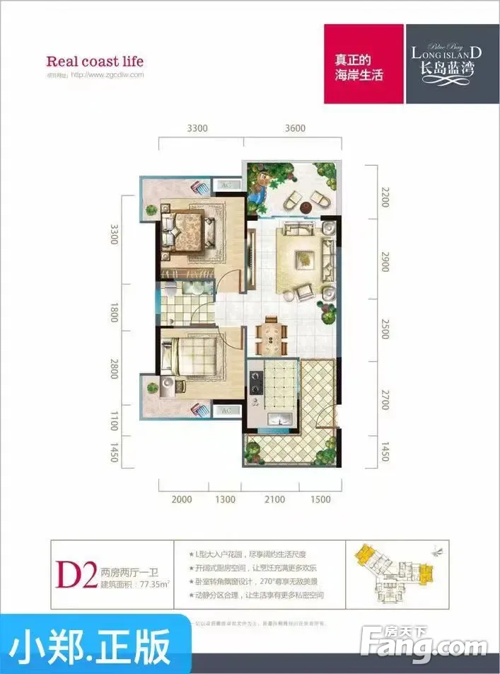 小郑为您解读户型: 77平米精装两房住宅,户型方正实用,通风采光好,通透性也很好,全明户型,高层看海,海边性价比很高的住宅社区。