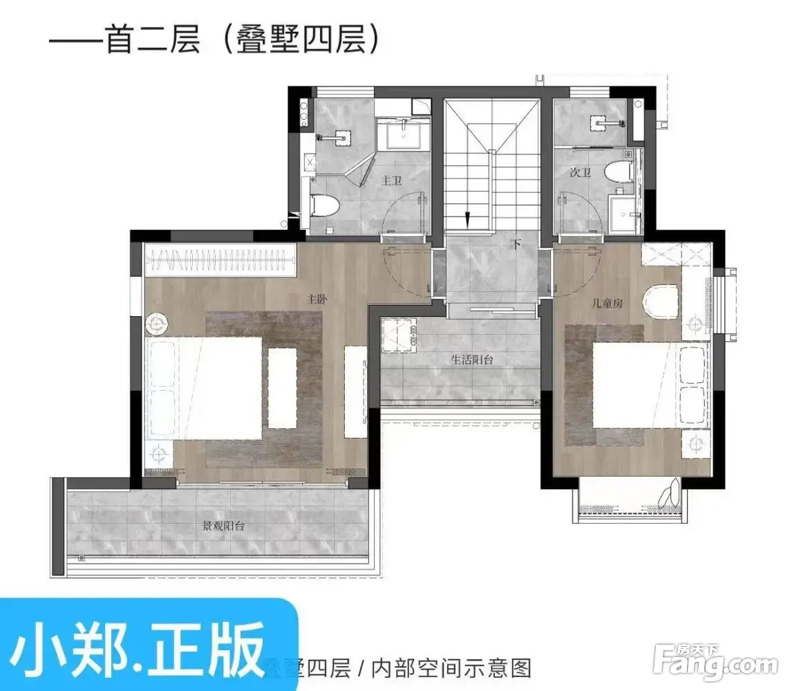 小郑为您户型解读: 145平米精装叠拼别墅,花园叠墅+星空叠墅,私属花园露台,享受田园生活,3.3米层高,动静分离,精装交付,现代风格别墅。