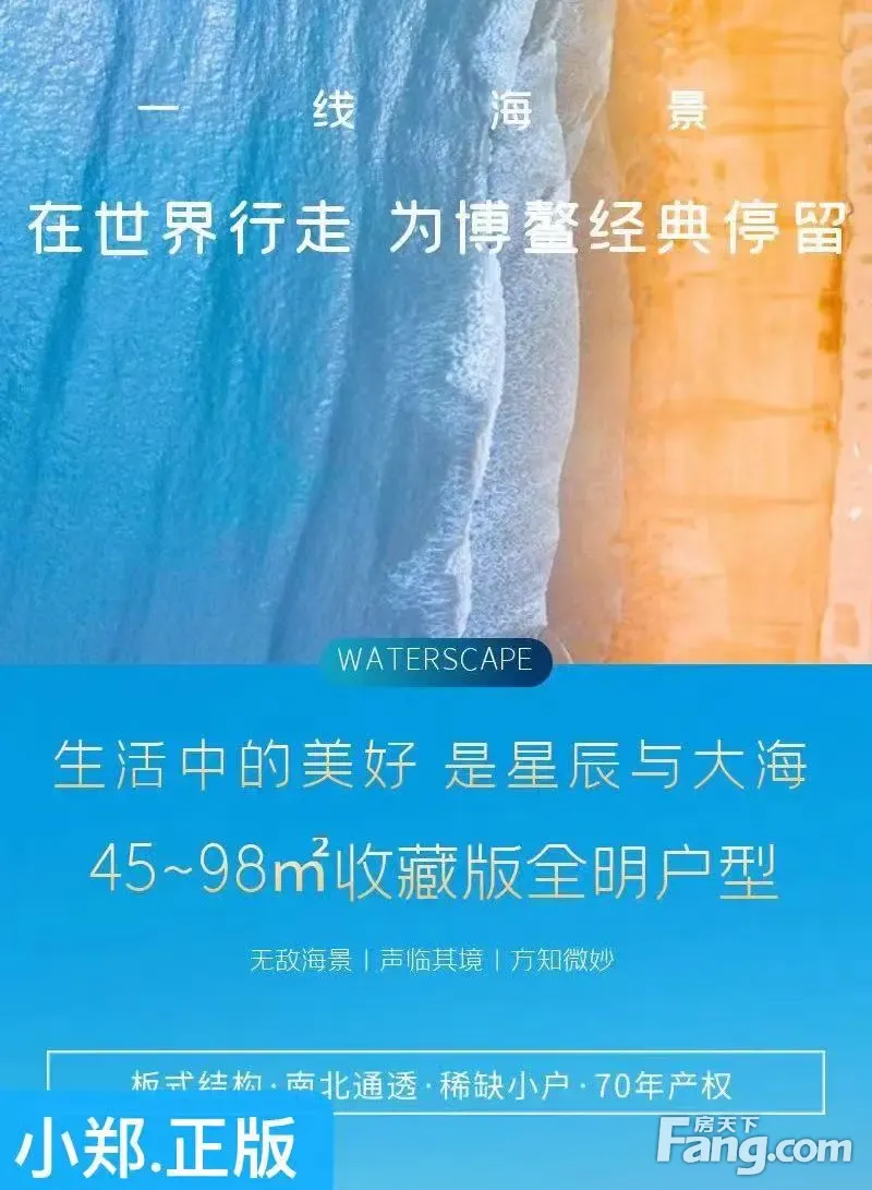 小郑为您解读户型: 户型方正实用,通风采光好,稀缺小两房户型,精装交付,一线海景房。